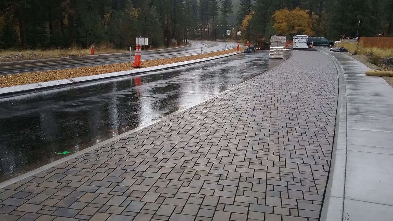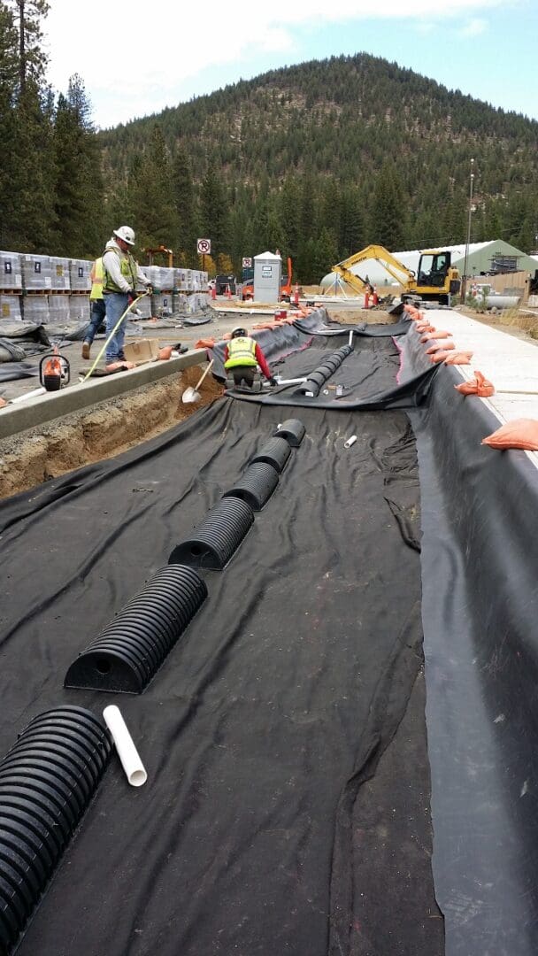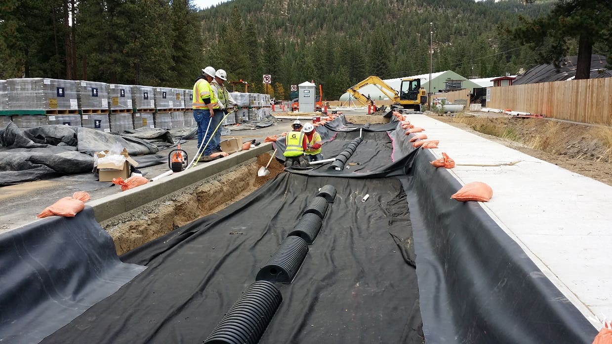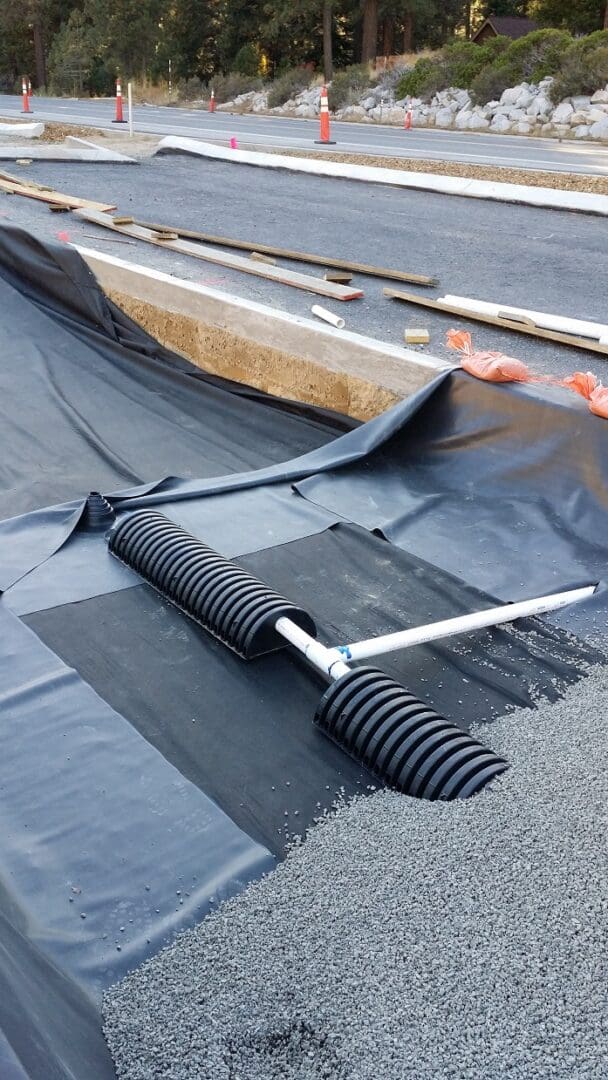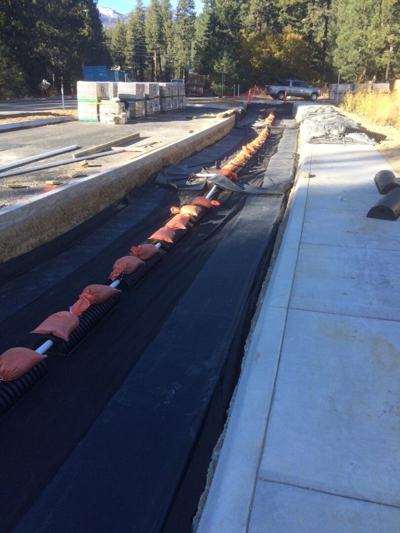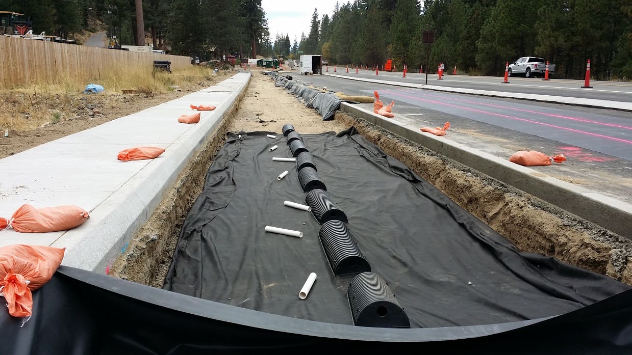 Wet weather already tested the installation this week as the project is finishing up the first phase before the 2016/2017 winter season. The design of the EPIC chamber allows for natural oil / grease separation that keeps the hydrocarbons in the #10 sieve gravel layer. These contaminants decompose by microbiological degradation in the aerobic profile, and filter pollutants from entering Lake Tahoe. Sediments are filtered at the surface and easily maintained by NDOT street sweeper VAC trucks. The EPIC system allows for more efficient real estate use at the site; the storm pond volume requirements are met in a shallow space below the driveway itself.
